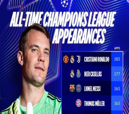 2025-10-01欧冠联赛阶段第二轮,拜仁客场5-1大胜帕福斯,此役首发出战的门将诺伊尔以152次出场追平本泽马,升至欧冠正赛历史...