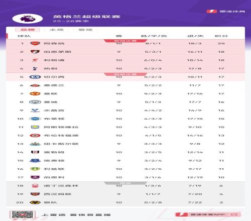 雷速体育11月2日宣 英超第10轮比赛已经7场战罢。最新积分榜方面,阿森纳8胜1平1负,目前以25分领跑。伯恩茅斯少赛一轮落后榜首7分,暂居次席。