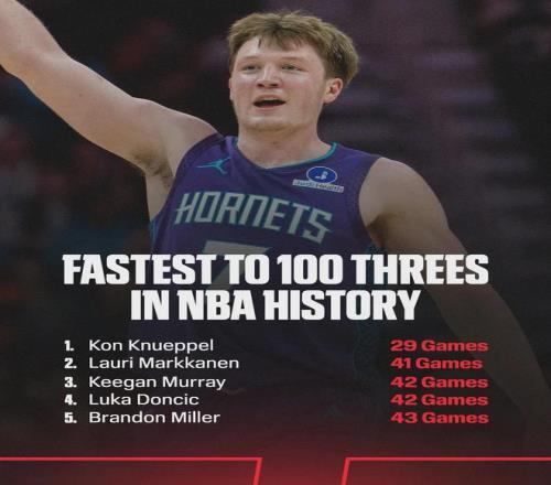 这个是NBA生涯前100记三分,此前纪录是马尔卡宁的41场,如今克尼佩尔比他少用了12场。克尼佩尔新秀赛季11次单场以三项命中率50%/40%/90%砍下20+,追平库里的纪录,并列NBA历史第一。再达成一场,就将超越库里!