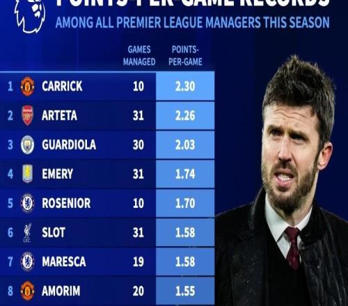 北京时间3月25日,德转统计出了本赛季在英超至少执教3场比赛的26位主帅场均积分,曼联新帅卡里克执教10场场均2....