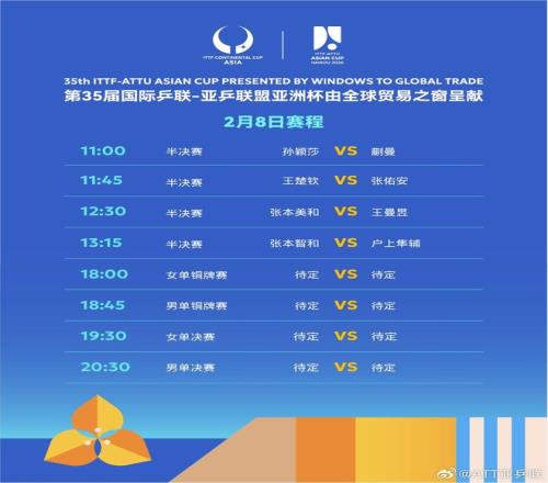 2月8日,第35届国际乒联-亚乒联盟亚洲杯进入最后一个比赛日。女单比赛中,3名中国选手挺进半决赛。孙颖莎对阵蒯曼,王曼昱则将对阵张本美和。男单比赛中,王楚钦将在半决赛对阵中国台北选手张佑安。
