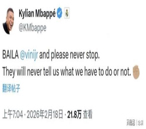 北京时间2月18日,欧冠淘汰赛附加赛首回合,皇马客场1-0击败本菲卡,维尼修斯进球后跳舞庆祝,疑似遭到本菲卡的阿根廷前锋普雷斯蒂亚尼的种族歧视,对此,姆巴佩全力支持自己的队友!