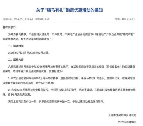 《通知》显示,为助力锡马赛事,无锡市住房城乡建设局、市体育局、市房地产业协会组织全市43家房地产开发企业开展购房优惠活动——凡已通过官网报名参加2026无锡马拉松赛事的选手,于活动期间在市区指定楼盘购买新建商品房的,均可享受开发企业的购房优惠。