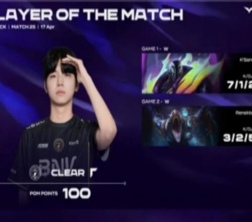 体育资讯4月17日称 LCK第二赛段BFX以2-0横扫了KRX,Clear整个系列赛发挥出色,斩获BFX对阵KRX系列赛POM。