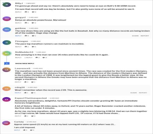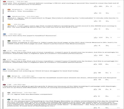 Cloé L.:我的天。居然有两个人!我完全无法想象跑出1小时59分41秒却只拿第二是什么感觉。你们必须大篇幅报道这件事,这个成就太疯狂了。