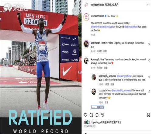 在萨维打破世界纪录之后,也有网友前往已故的前世界纪录保持者凯尔文·基普图姆(Kelvin Kiptum)的社交媒体留言