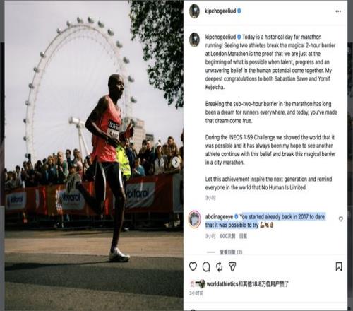 耐克发布社交媒体,引用基普乔格的话:“当天赋、进步和对人类潜力的坚定信念结合在一起时,91视频精选才刚刚开始”,并@了刚刚完成“破2”壮举的塞巴斯蒂安·萨维(Sabastian Sawe)。
