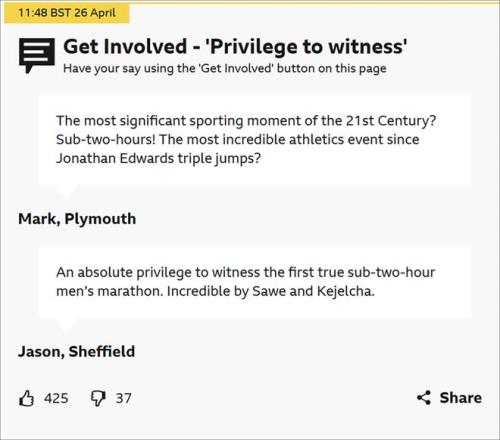 来自谢菲尔德的Jason:能够见证男子马拉松第一次真正意义上的破2,绝对是一种荣幸。萨维和凯杰尔查的表现不可思议。