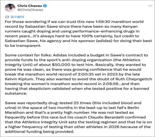 给大家一些背景:阿迪达斯在萨韦的合同中包含了一笔预算,向体育界的反兴奋剂组织提供约5万美元的资金来对他进行检测。基本上,他们想证明他是干净的,因为人们越来越相信他会打破已故凯尔文·基普图姆在2023年创下的2:00:35马拉松世界纪录。他们还想避免像鲁斯·切普盖蒂奇打破女子马拉松世界纪录2:09:56那样引发疑虑……然后当她被检测出使用违禁物质时,这种怀疑被证实。